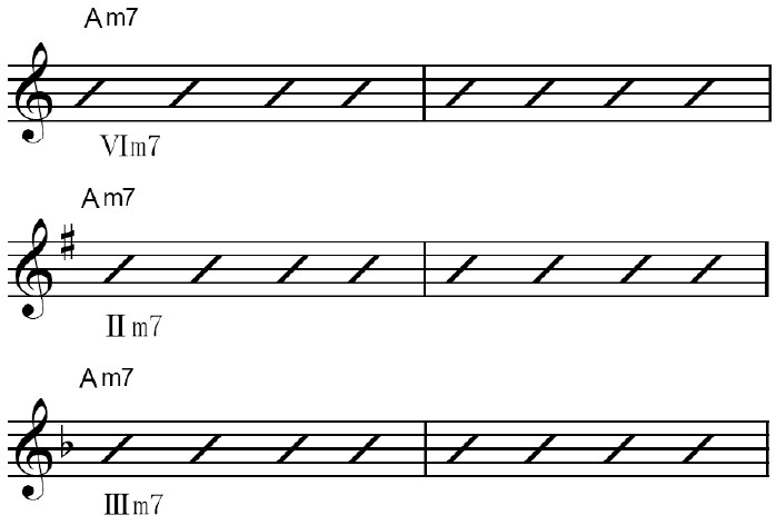 上記のAm7はすべてAm7ですが、キーがそれぞれ違うので、すべて別物と考えます。