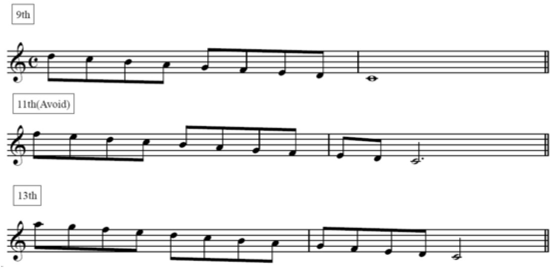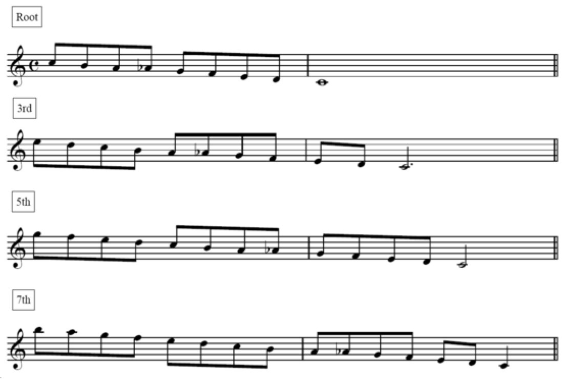 これはCの音(ルート)から下がるだけですが、他の音から下がるときにもいくつかバリエーションがあります。
