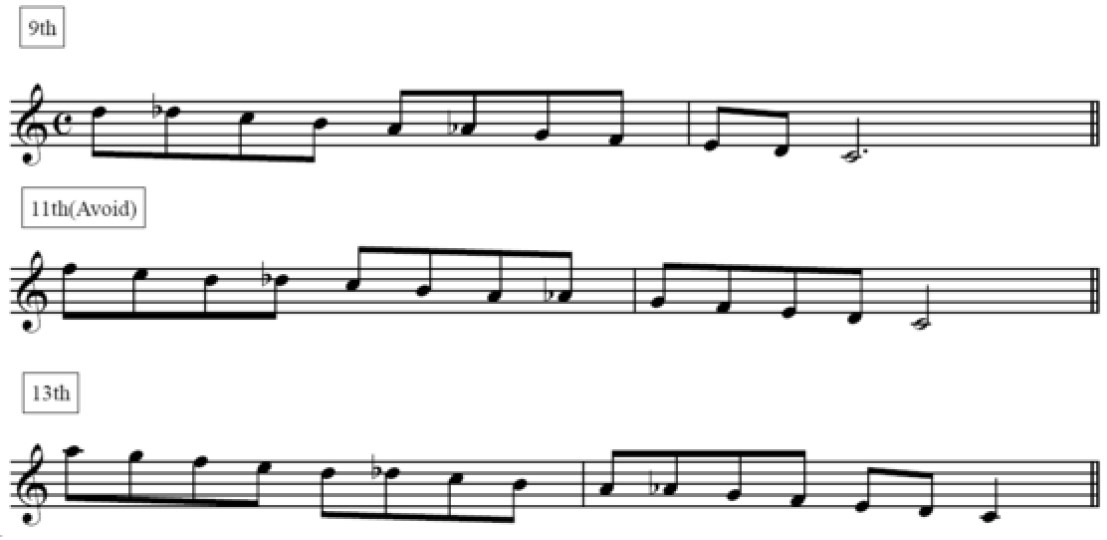 このように普通にスケールを下がるときには、ドシラソファミレド、、、、と下がるのではなく、上記の半音階を入れたメジャースケール=ビバップスケールで下がると非常にジャズ的に聞こえます。