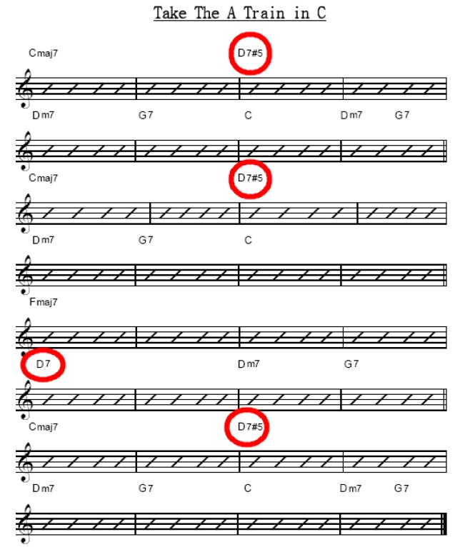 そして、その代表曲として、Duke Ellingtonの”Take The A Train”が挙げられます。以下に同じコード進行を載せます。