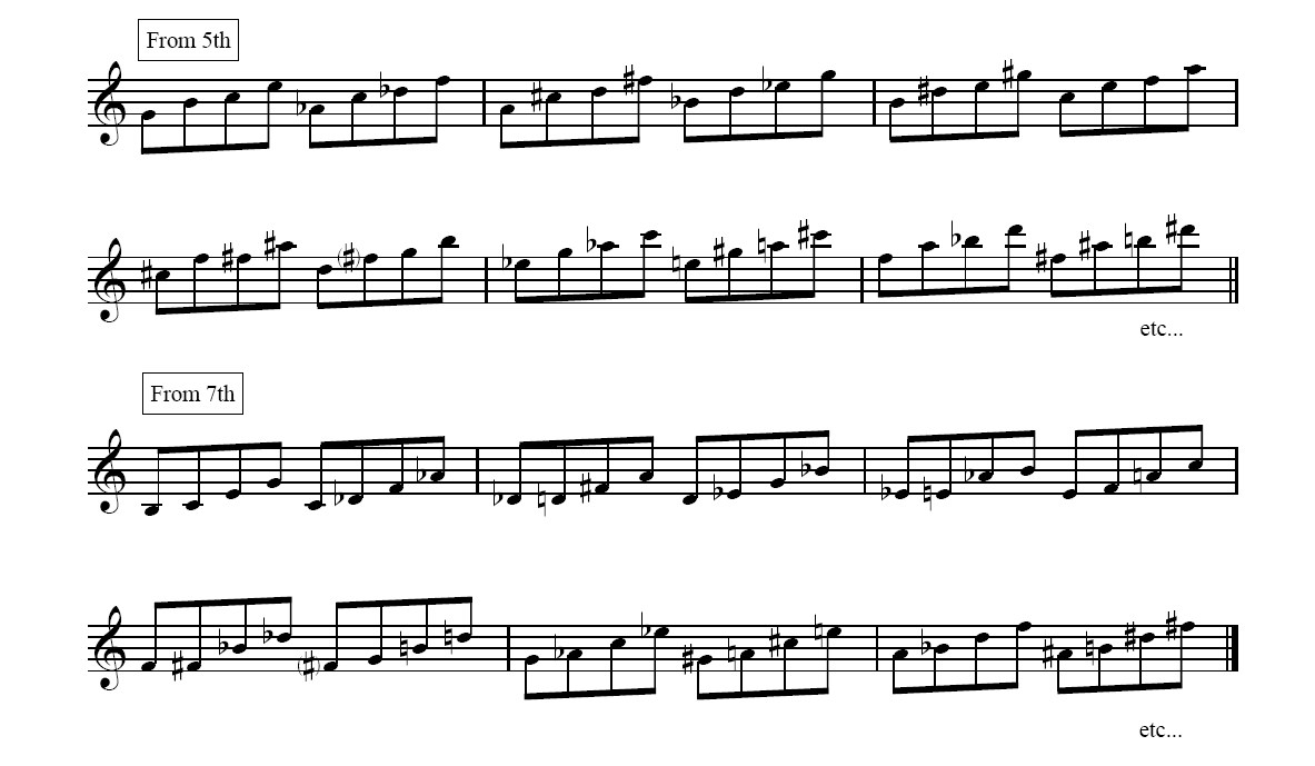 しつこいですが、、、、、、 コード進行をみて、そのコードが何の音で構成されてるか見えなければアドリブはできません。 そういう意味でも、これらのコードを分散和音で弾けるようになることは非常に重要です。