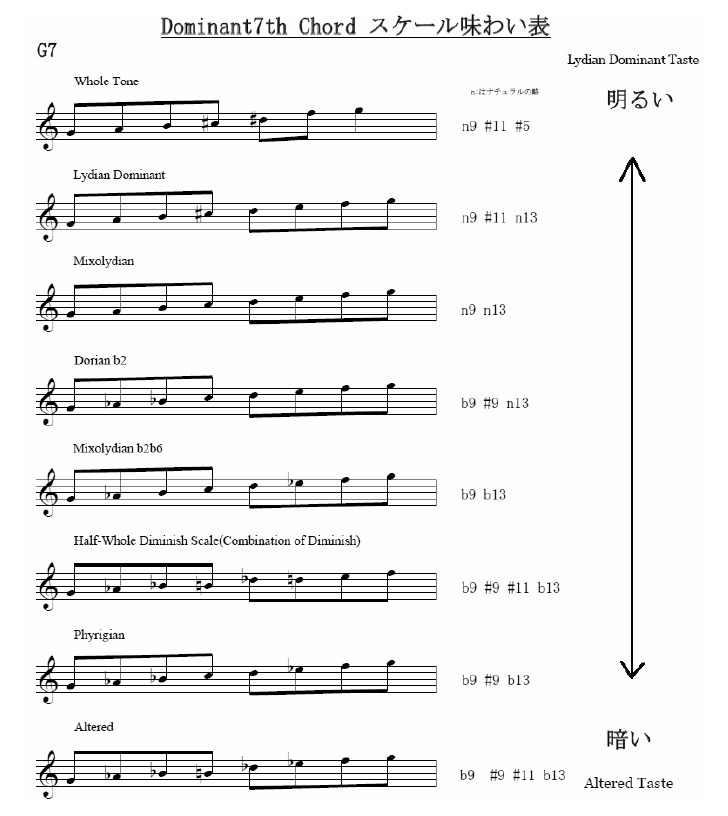 そりゃそうですよね、、明るい方にはシャープ系、ナチュラル系のテンションがたくさん入っているのに対し、下に行けばいくほど、フラット系のテンションが増えてきます。