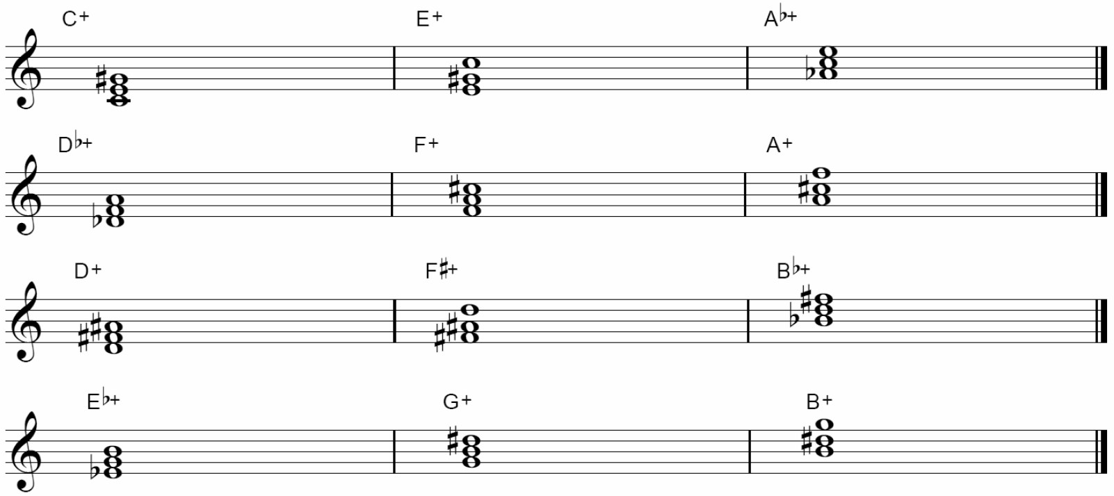 オーギュメントのトライアドもディミニッシュ同様、展開するとほかの3つと同じ形になります。