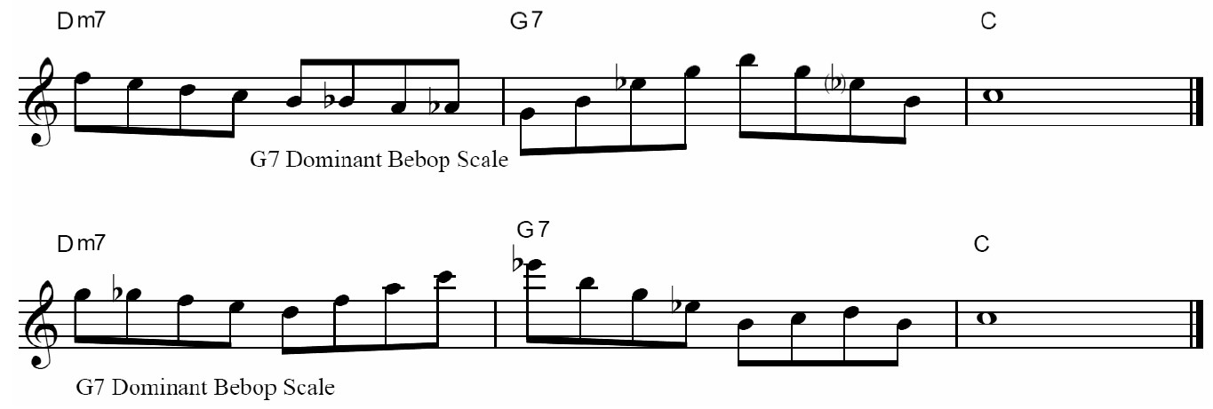 二つの例ともⅡm7ではビーバップスケールを使用しています。 G7にたどり着いたときにはG7の分散和音を丸出して使用しています。