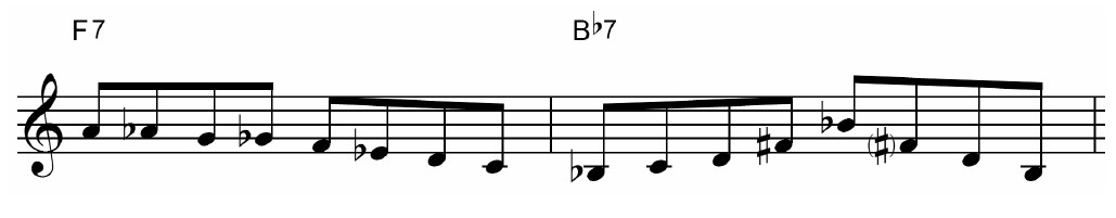非常にシンプルでいい使い方です。 その前のDb7の代わりにF7をつけて3度からの下りるビーバップスケールを使用しています。