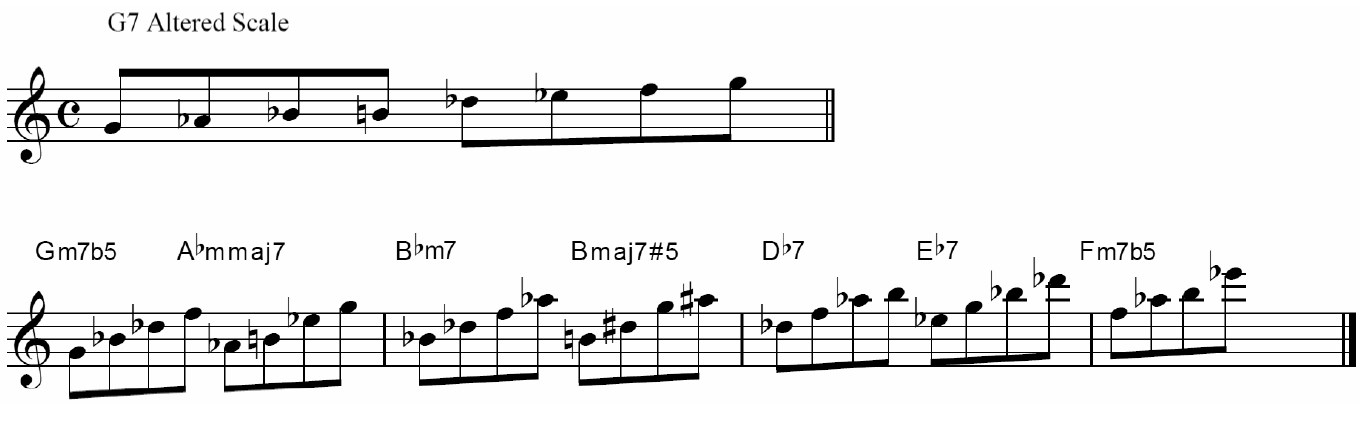 つまり、オルタードをみたらb5のトライアド、b6のトライアド、、、G7のばあいだとDb,Ebと考えたり、半音上のマイナーメジャーコード(Abmmaj7)、、、や三度からはじまるオーギュメントメジャーセブン(Bmaj7#5)、、、というふうに、 いろいろな形で引っ張り出せるように整理されています。