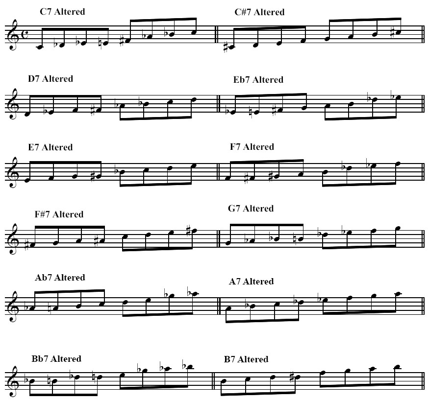 さて、そういうことで、今回はオルタードスケールを覚えて練習しましょう。