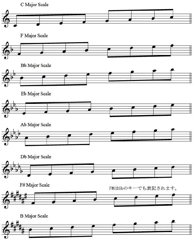 ①何とかメジャースケールの時には、何と何と何に#(あるいはb)がつく