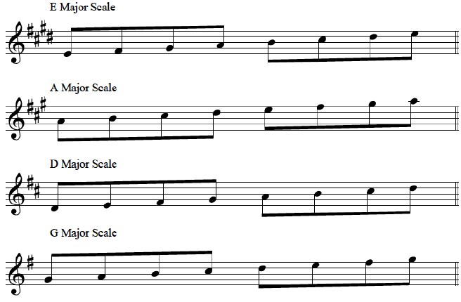 E MajorはCから右回りに4つなので、#が4つ付きます。