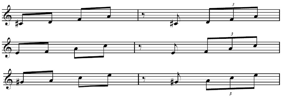 この3度の動き=分散和音的な動きが非常に重要で、ビバッププレーヤーではこのような動きがアドリブの中に多く見られます。