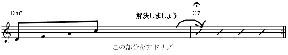例えば(このたとえばいらない、、、)、一番最初の例を使って示すと、最初の2拍は今回練習した事を使い、、3拍4拍めではG7にたどり着くようアドリブの練習をしましょう。 その際にG7には解決するように気をつけましょう。 (解決の説明はこちら)