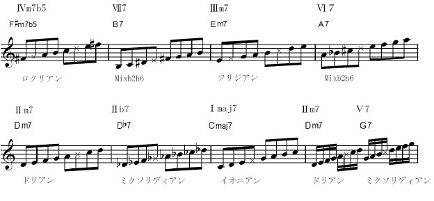 それ以外のスケールは、フラット系、ナチュラル系に分けて12キーで巻末にまとめて載せてありますので、各自参照されてください。