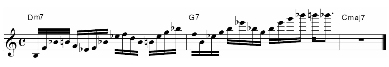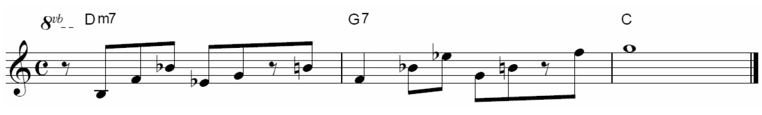 ツーファイブでⅡm7を無視して、G7を2小節想定して上のスケールの動きを使ってみましょう。